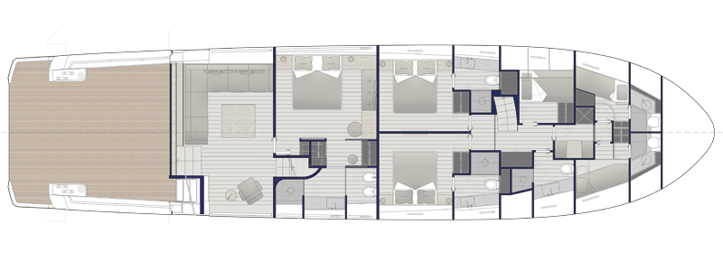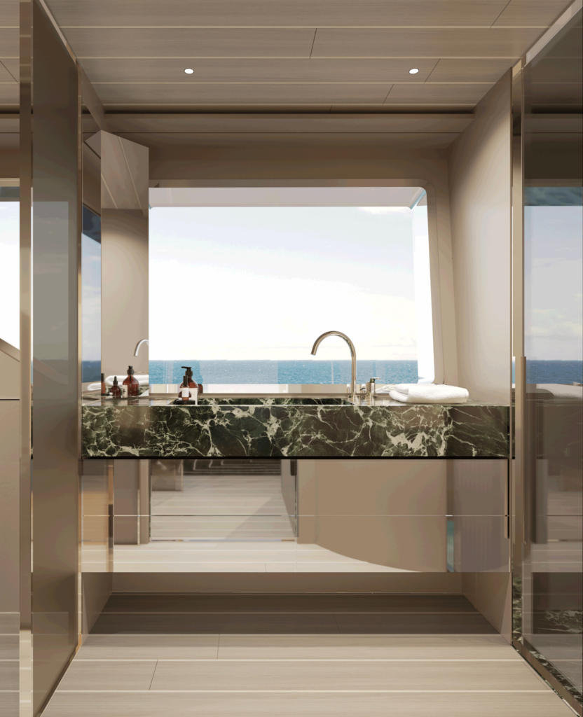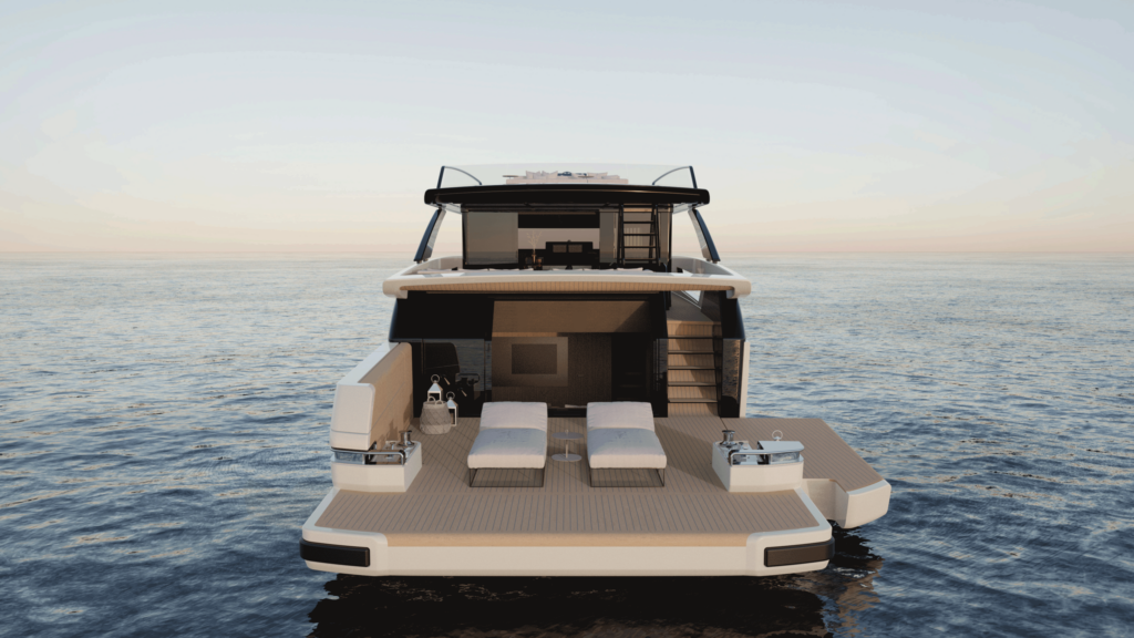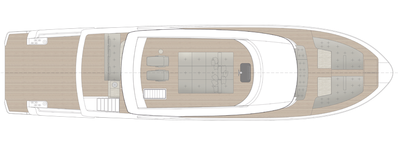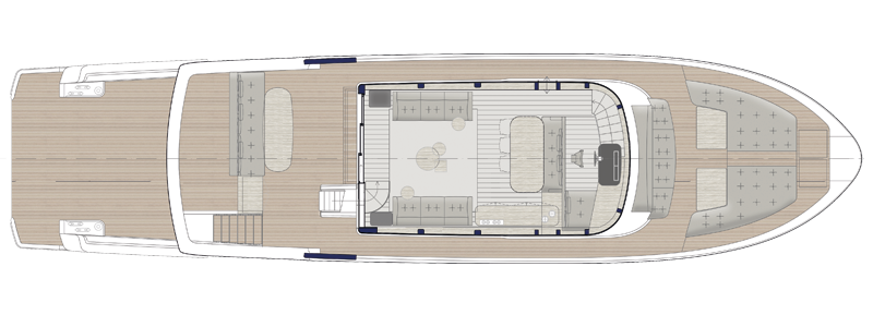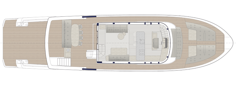 The spectacular aft salon entrance creates a unique onboard flow, linking the water directly to the heart of the yacht. The helm station, now located on the flybridge under a sleek hardtop, frees up the interior and offers an elevated and open navigation with an incredible panoramic view. At the stern, a hydraulic platform with side openings transforms the beach area into an expansive relaxation zone on the water.