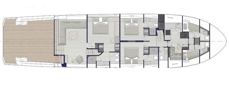 The enhanced crew quarters ensure discreet, top-tier professional service. Design, spaces, materials, every detail of the BGX83 is crafted to deliver maximum comfort and a yachting experience that rivals much larger vessels.