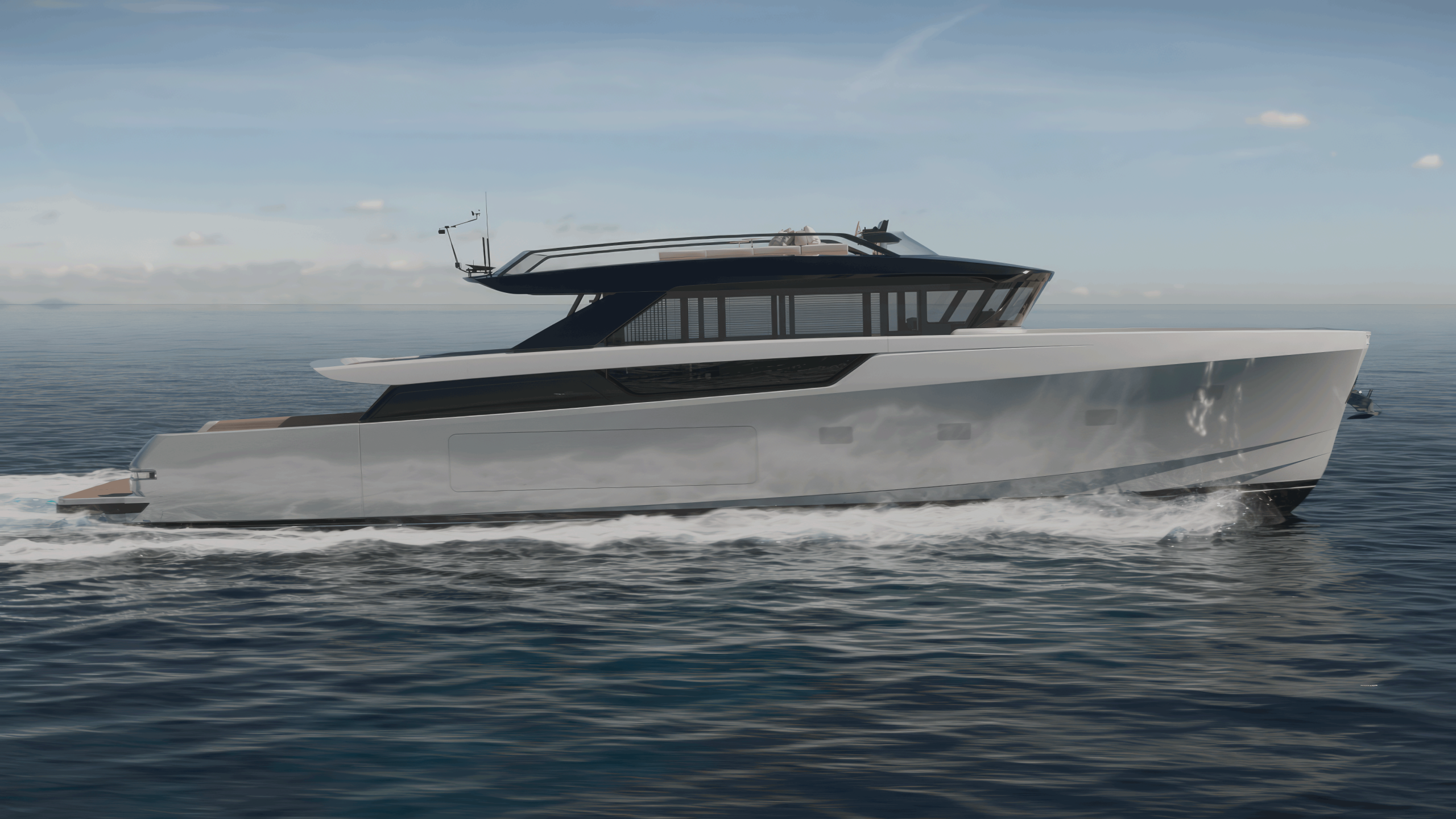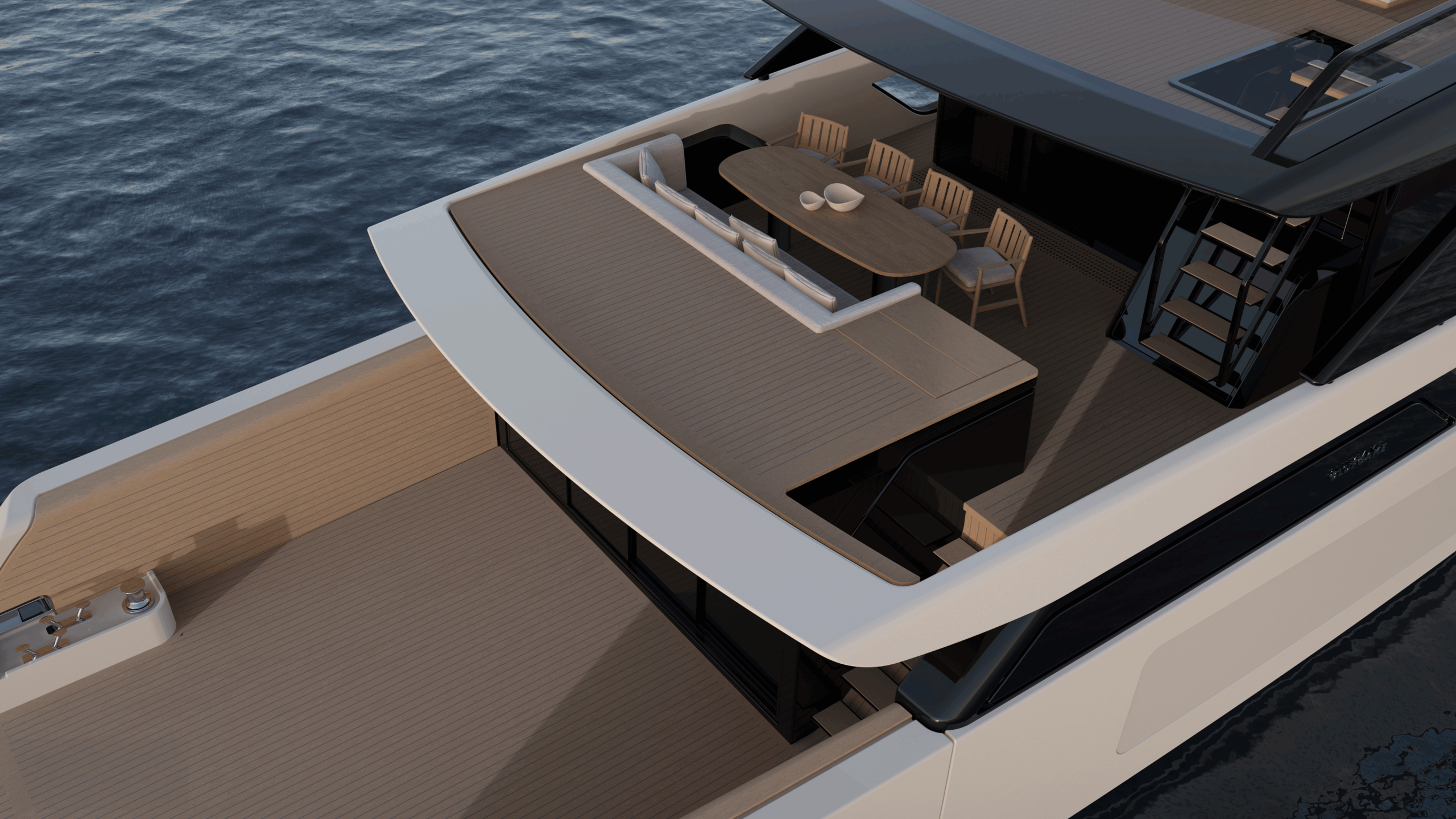 The spectacular aft salon entrance creates a unique onboard flow, linking the water directly to the heart of the yacht. The helm station, now located on the flybridge under a sleek hardtop, frees up the interior and offers an elevated and open navigation with an incredible panoramic view. At the stern, a hydraulic platform with side openings transforms the beach area into an expansive relaxation zone on the water.