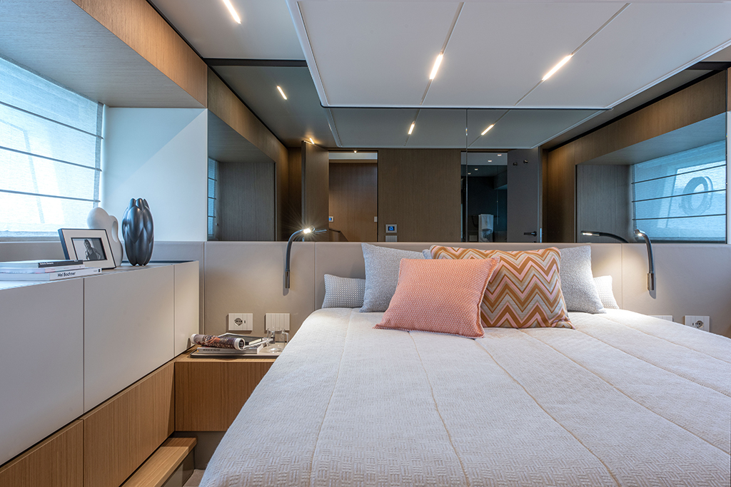 Finalmente, los motores de propulsión Volvo IPS permiten una reducción de las dimensiones totales en la cubierta inferior, ofreciendo la posibilidad de elegir entre 3 camarotes o 2, uno de los cuales es un patrón de manga completa: una adición única para barcos de esta gama.